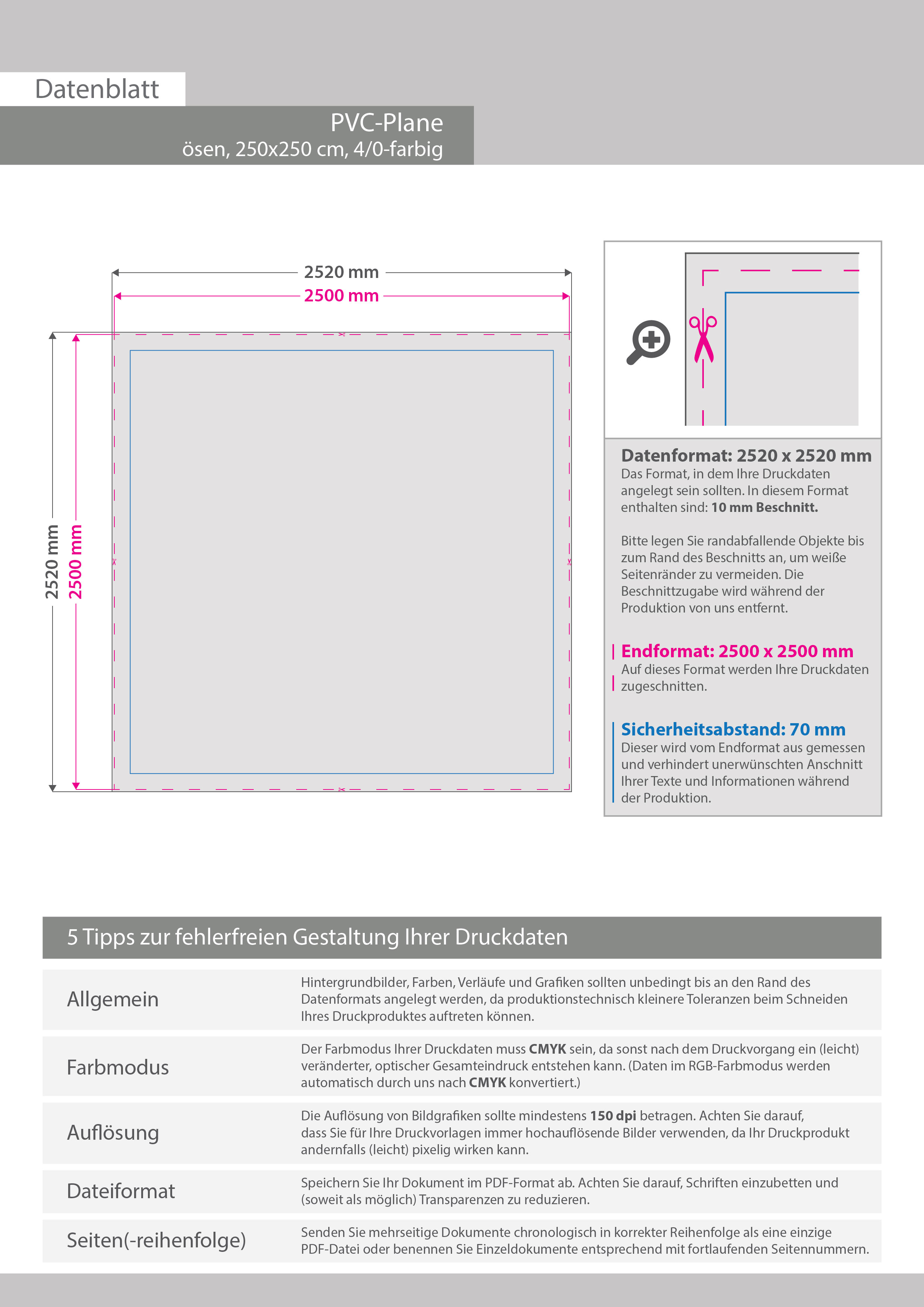 Hochwertige PVC-Plane 250 x 250 cm, 4/0-farbig bedruckt, Ösen im Abstand von 50 cm links und rechts