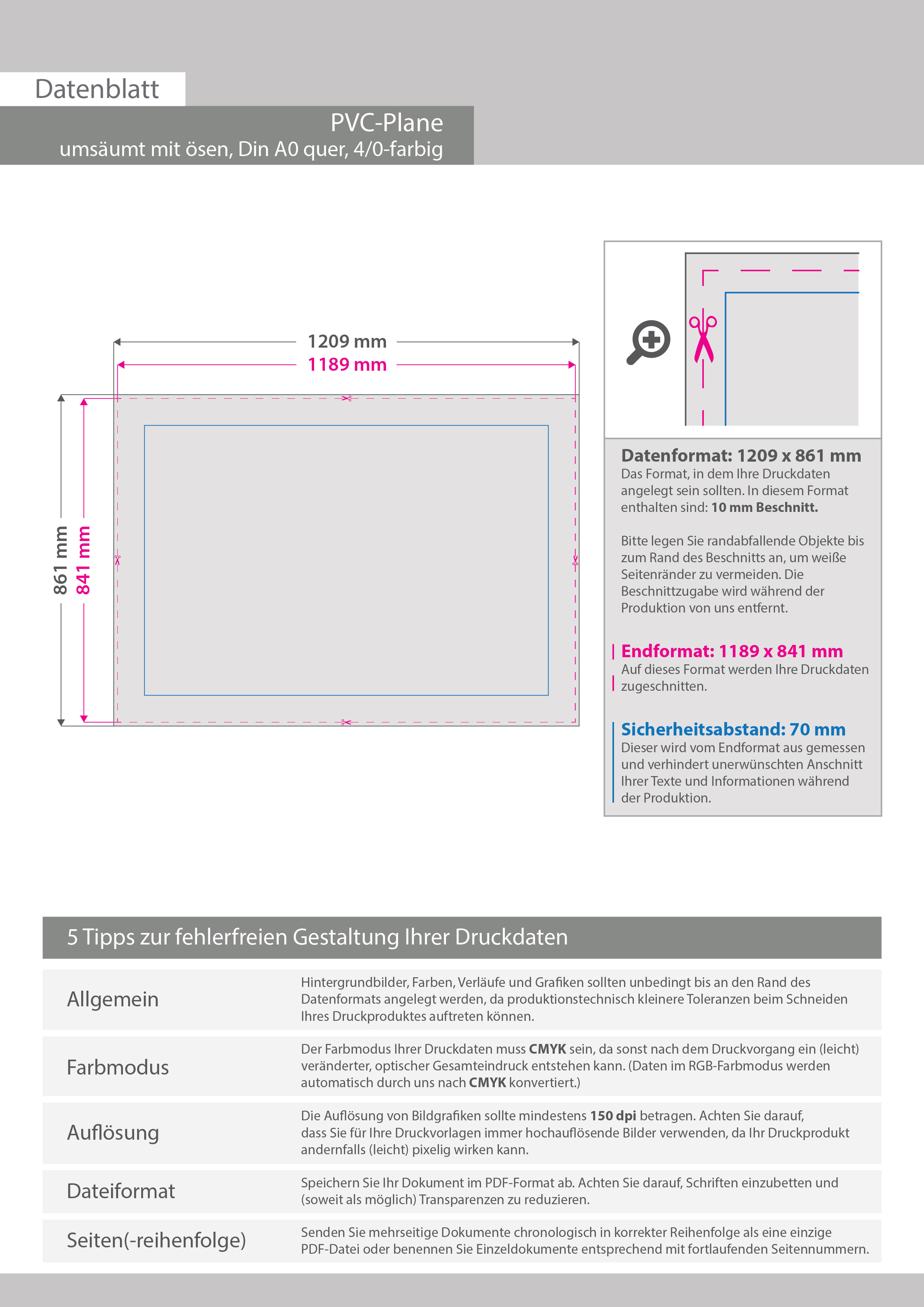 Hochwertige PVC-Plane DIN A0 quer (118,9 x 84,1 cm), 4/0-farbig bedruckt, Umsäumt + Ösen im Abstand von 50 cm oben und unten