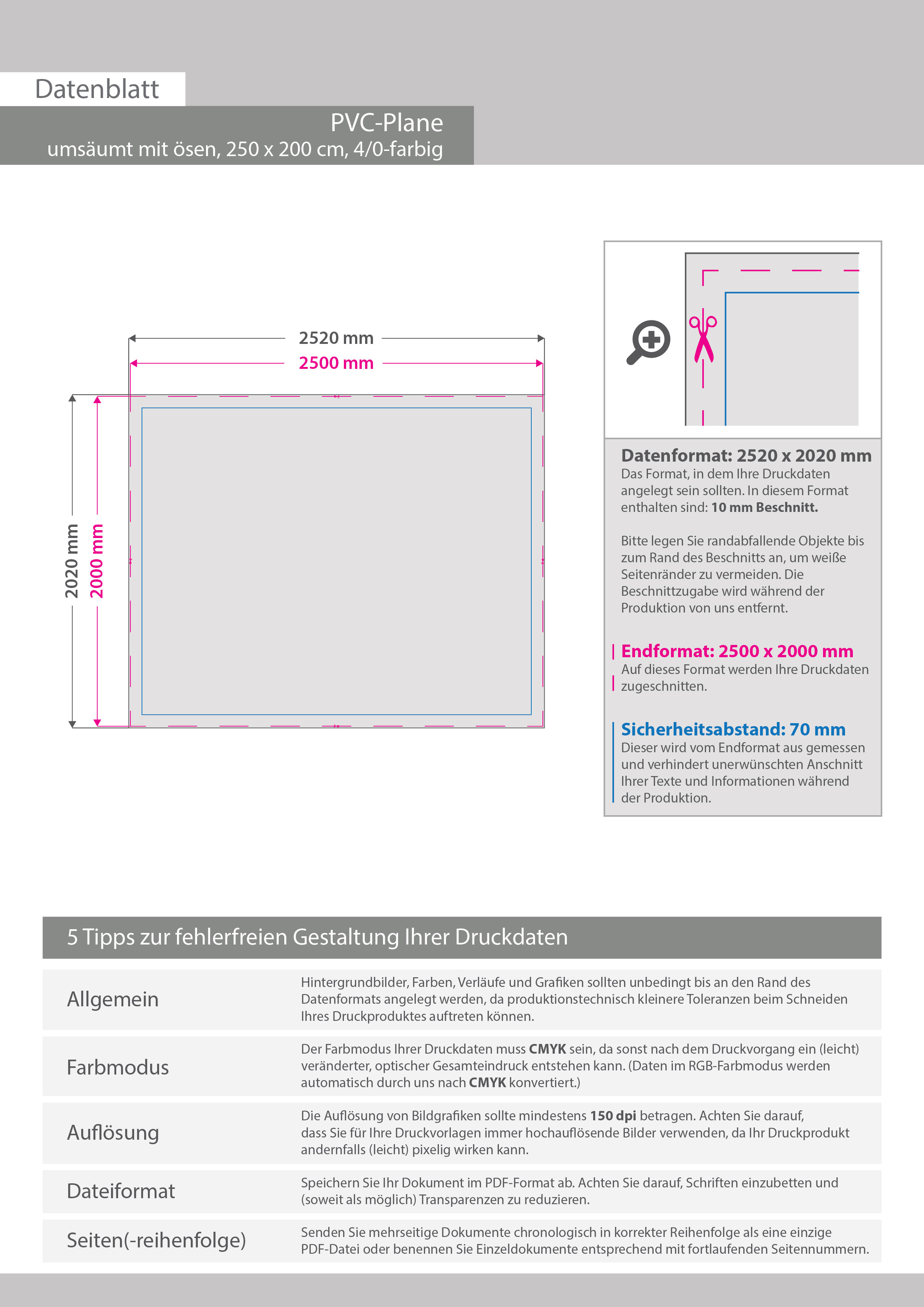Hochwertige PVC-Plane 250 x 200 cm, 4/0-farbig bedruckt, Umsäumt + Ösen im Abstand von 50 cm oben und unten