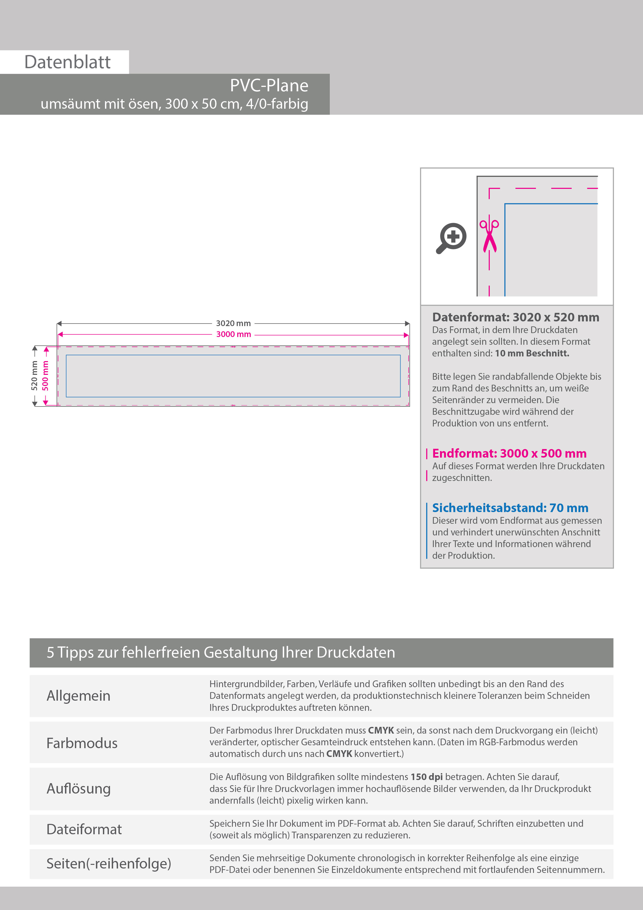 Hochwertige PVC-Plane 300 x 50 cm, 4/0-farbig bedruckt, Umsäumt + Ösen im Abstand von 50 cm oben und unten