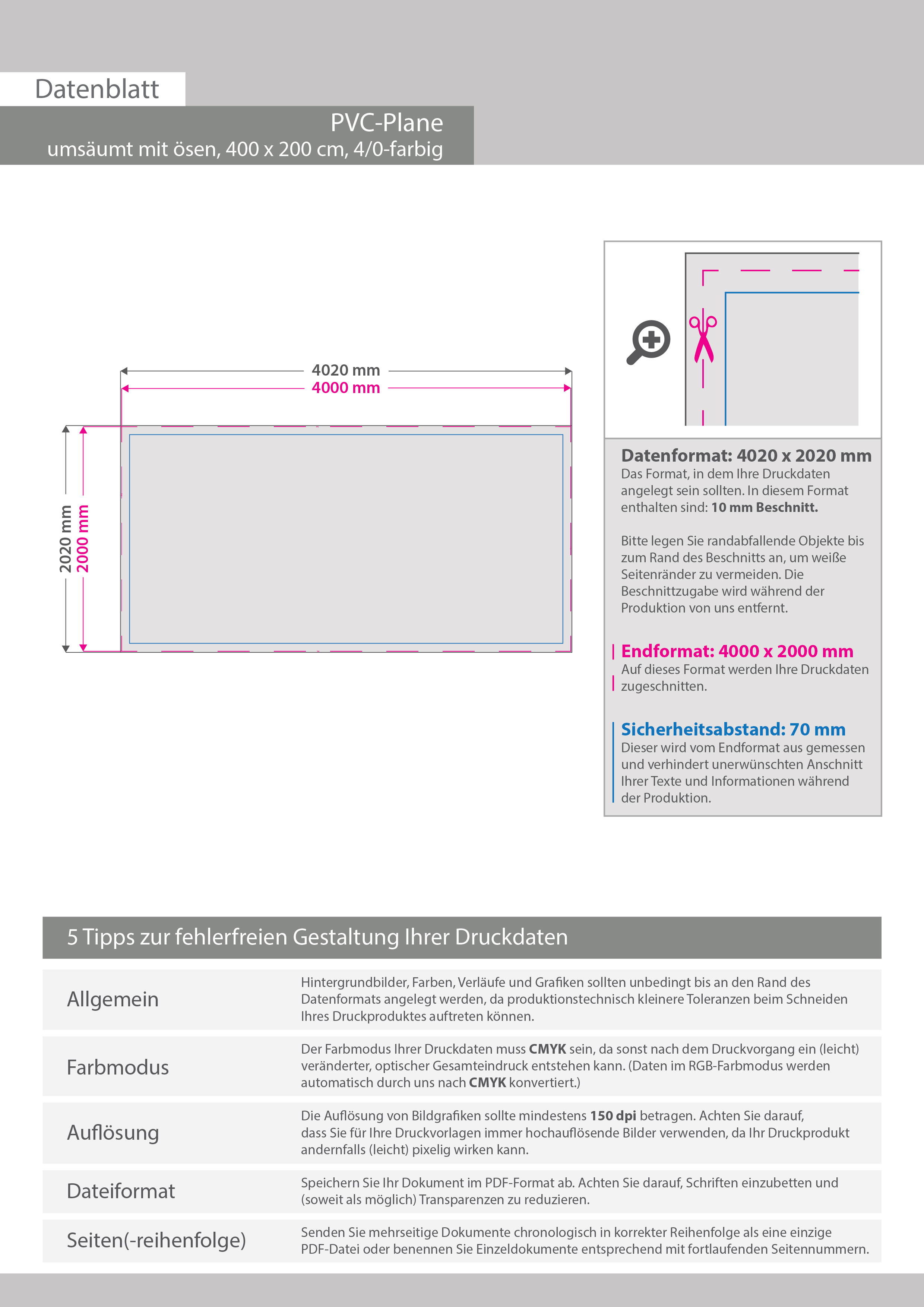 Hochwertige PVC-Plane 400 x 200 cm, 4/0-farbig bedruckt, Umsäumt + Ösen im Abstand von 50 cm oben und unten