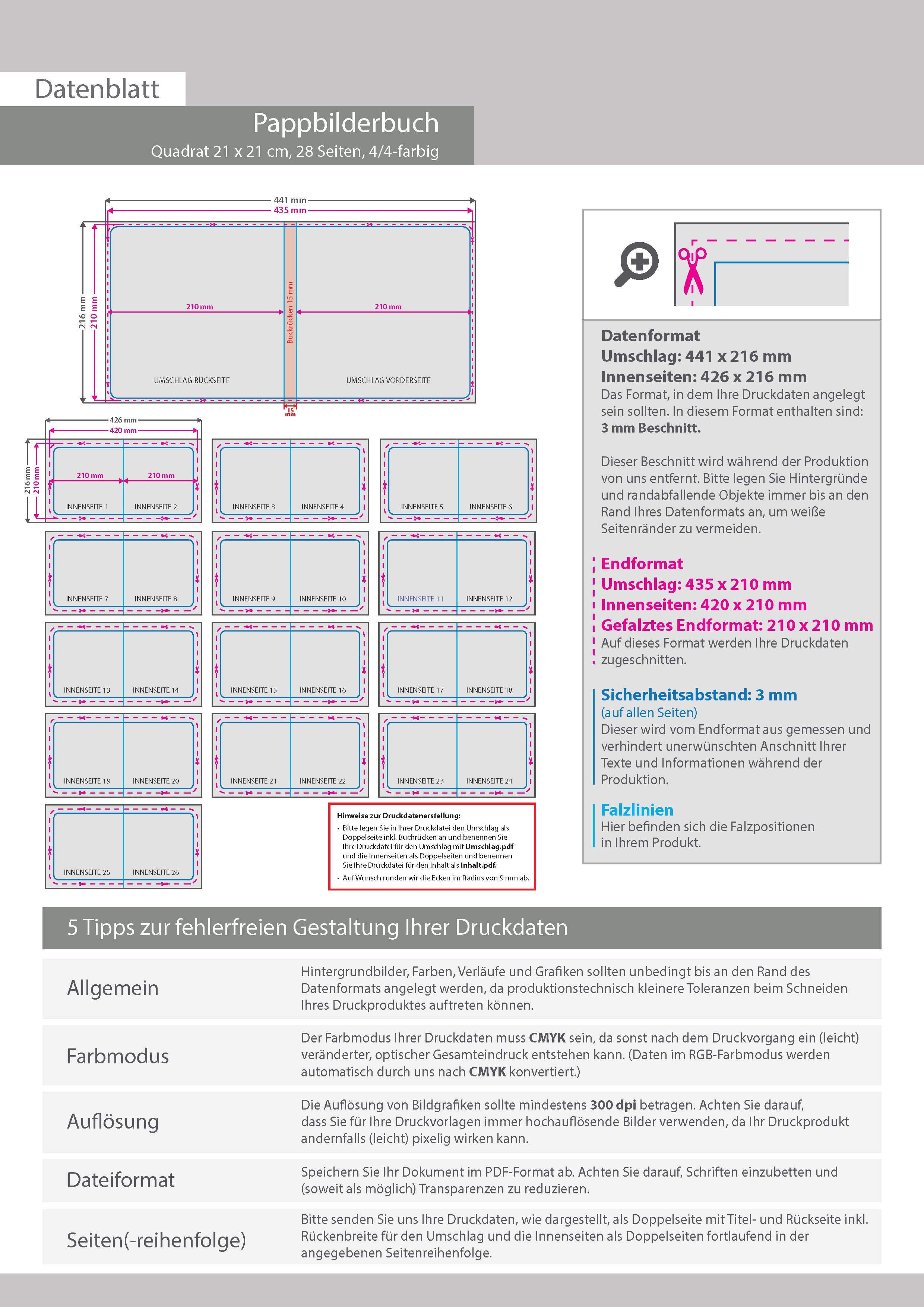 Pappbilderbuch mit Lay-Flat-Bindung, Quadrat 21 x 21 cm, 28 Seiten, 4/4-farbig beidseitig bedruckt