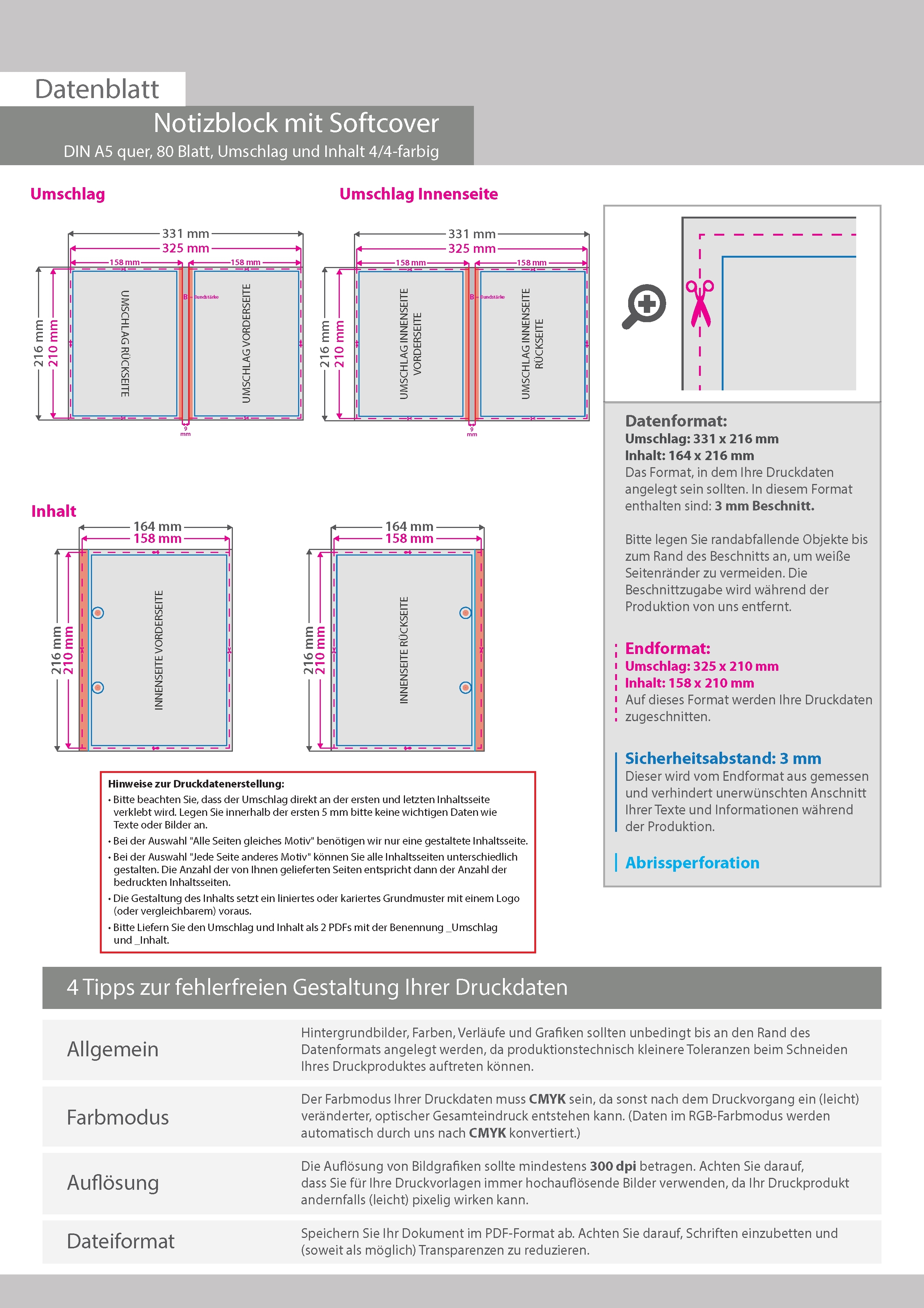 Block mit Softcover, DIN A5 quer, 80 Blatt, Umschlag und Inhalt 4/4-farbig CMYK beidseitig bedruckt